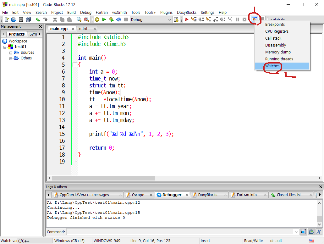2-1. Watches 가 보이지 않는 경우 1 : 메뉴 > Debug > Debugging windows > Watches 클릭