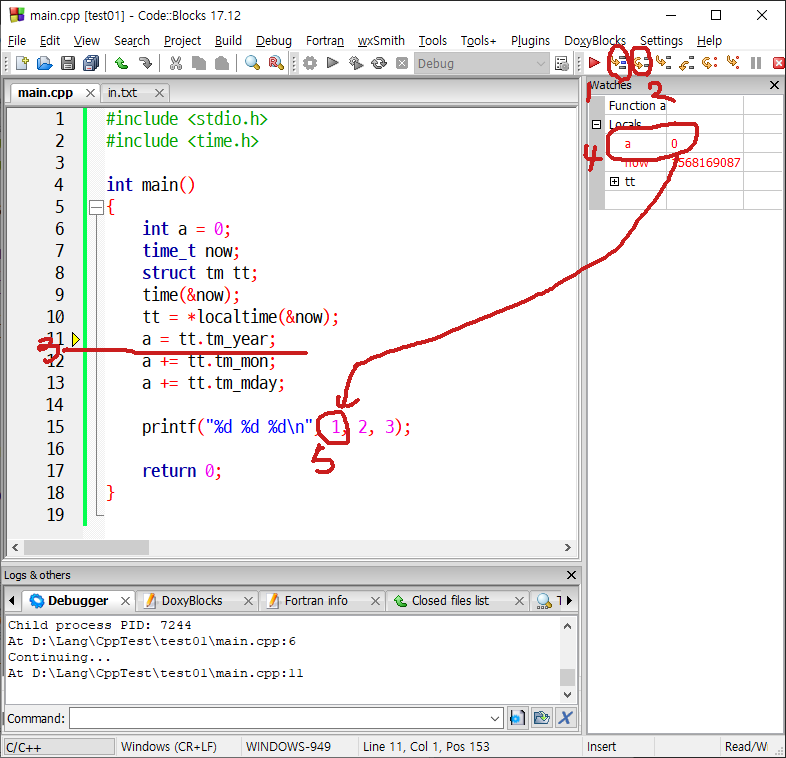 3. 11행(3) 까지 run to cursor(1) 또는 next line(2)를 이용하여 이동합니다. 이동훈 watches에서 a의 값을 1(5) 자리에 입력 합니다.